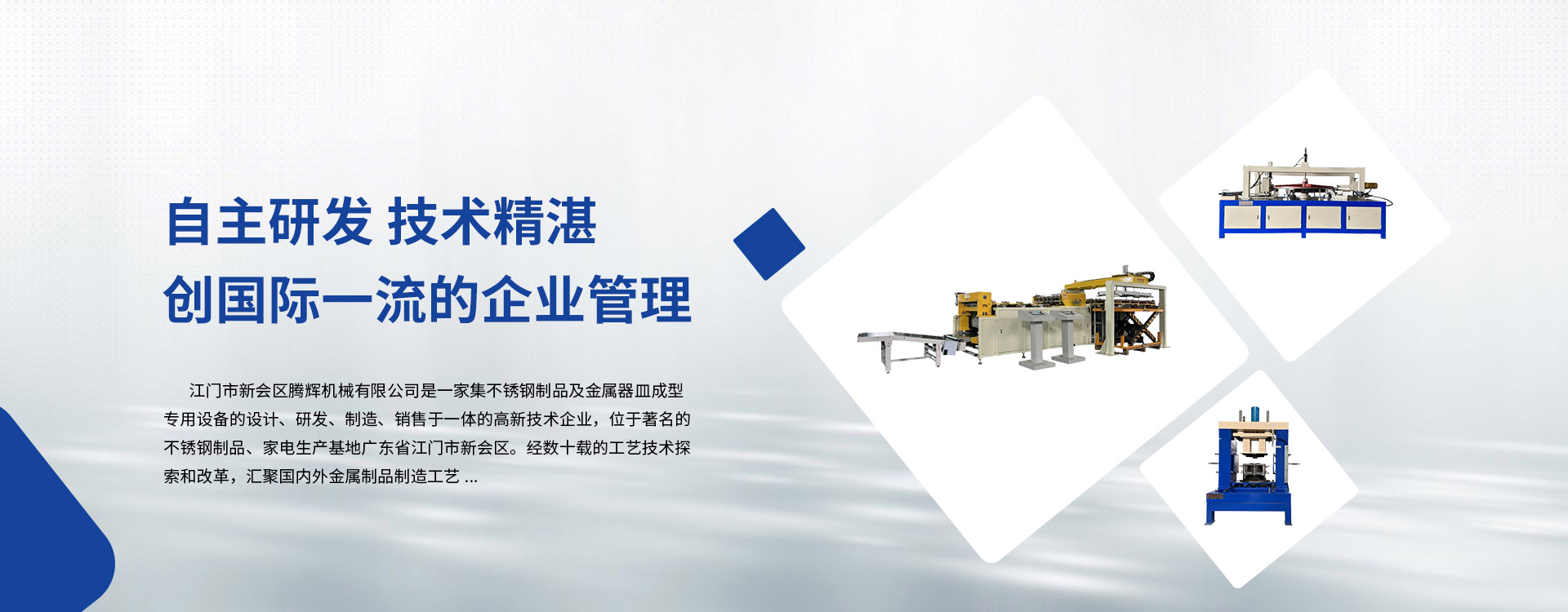 江門市新會區騰輝機械有限公司是一家集不銹鋼制品及金屬器皿成型專用設備的設計、研發、制造、銷售于一體的高新技術企業,位于著名的不銹鋼制品、家電生產基地廣東省江門市新會區。經數十載的工藝技術探索和改革,匯聚國內外金屬制品制造工藝。